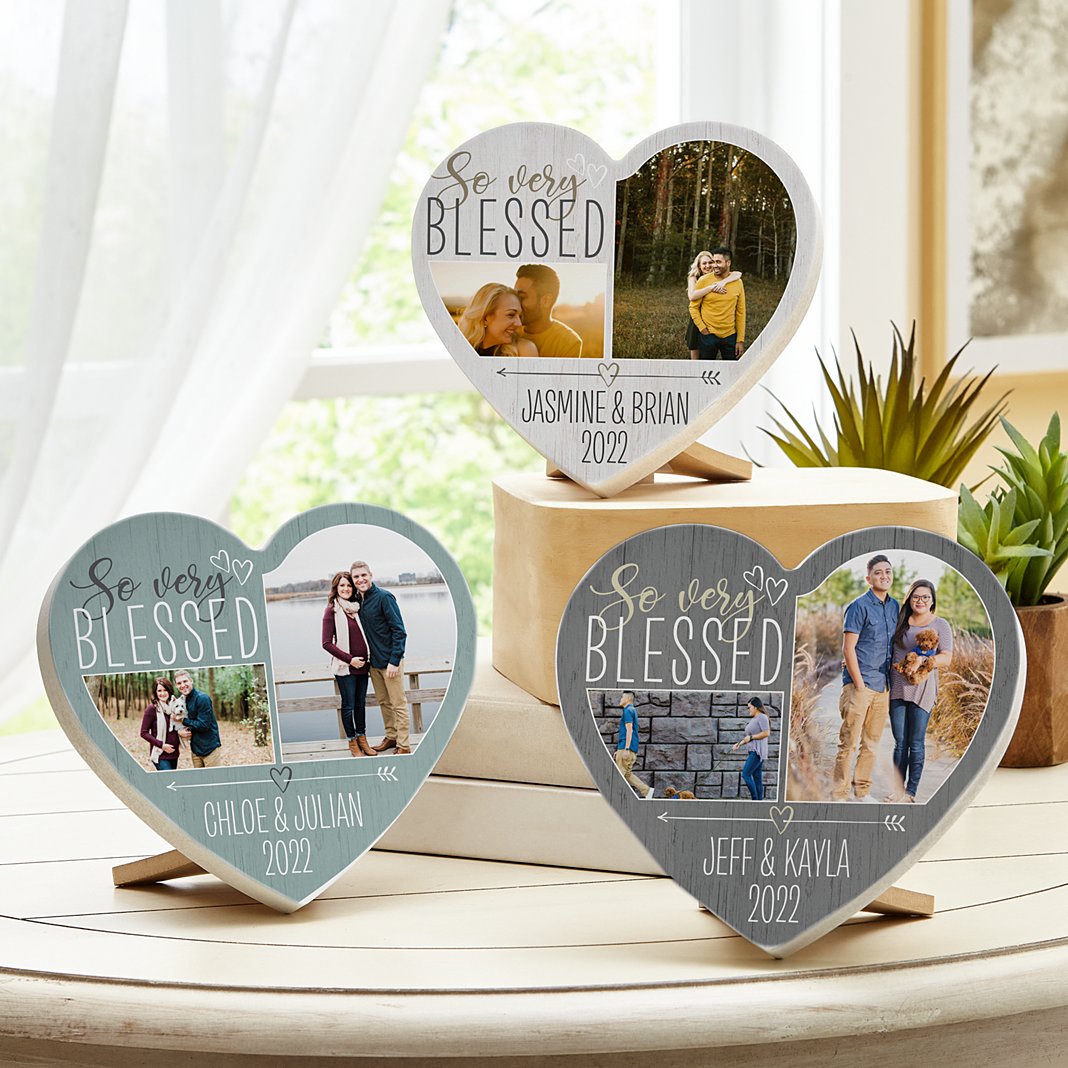 This beautiful photo accent piece is a daily reminder to give thanks for the ones who fill your heart with love, laughter and joy. Made in USA Made of wood Includes easel back Measures 5.5"x6" Available in aqua, gray and white designs Personalize with 2 photos and any 2 line message, up to 18 characters on the first line and up to 8 characters on the second line "So very blessed" will always appear