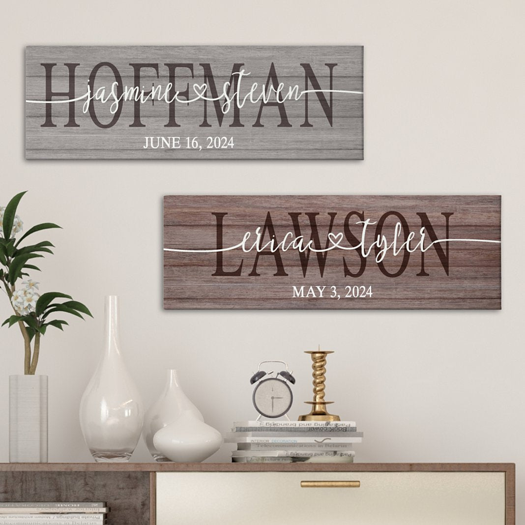 Its a sign! Their love will last forever. Two heartfully connected names turn into a single love line that will never end. This thoughtful, one-of-a-kind custom wall decor will serve as a focal point in any room—today and for many happy years to come! Custom canvas is artfully designed & printed, then stretched over a solid wood frame Available in brown and gray to match any decor Personalize with any 2 names up to 10 characters each, last name up to 15 characters and any message up to 30 characters Sawtooth hanger included for easy hanging Measures 9"x27" Cannot be gift boxed Due to size and packaging requirements, item will ship separately from other items in your order