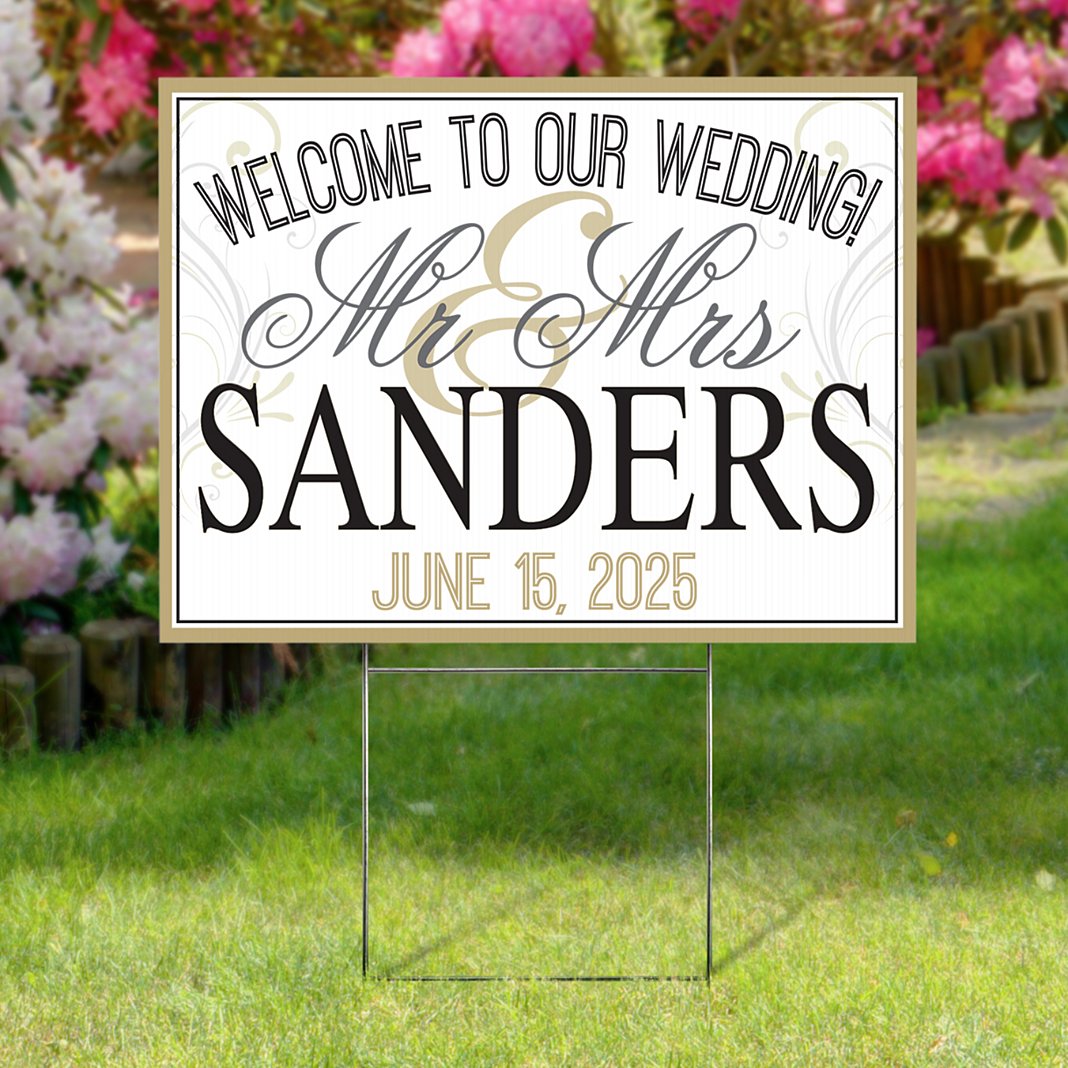Welcome the newly minted couple—and all of their guests—with this festive yard sign. Made of high quality 4MM white corrugated plastic Includes silver “H” yard stick for display Sign measures 18"x24" Prints from edge to edge with vibrant colors Available in 1 or 2 sided print Personalize with any title up to 25 characters, any name up to 15 characters and any message up to 30 characters Full edge to edge printing with vibrant colors 2 sided print design reflects the same on both sides Item cannot be gift boxed