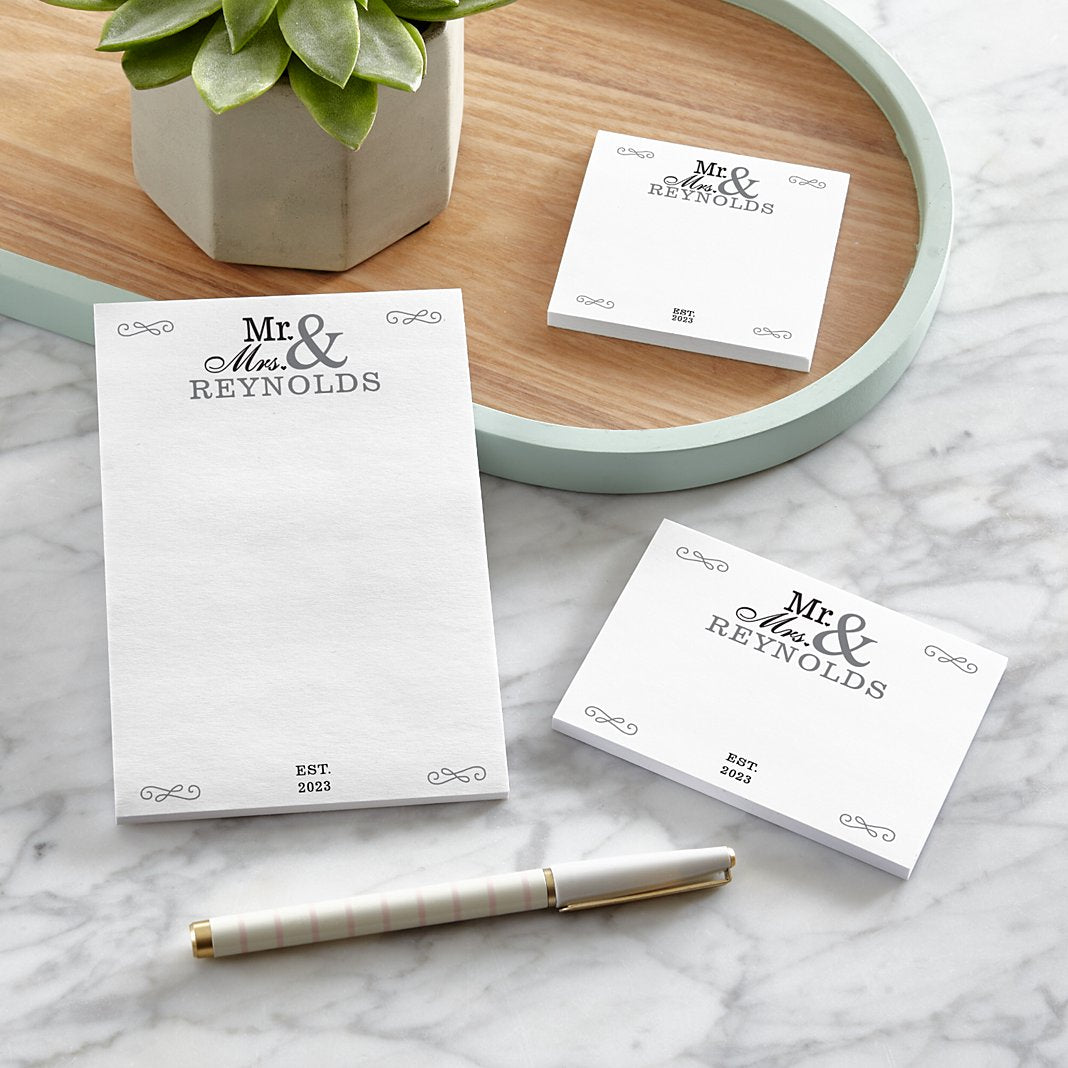 Add a truly personal touch to all your scribbles and reminders with these custom Post-It® Notes that honor the day you became a happy couple. Personalize with any title (choose from Mr/Mrs, Mr/Mr or Mrs/Mrs); any name up to 12 characters; and any 2-line message, up to 30 characters on each line Available in 3"x3", 4"x3" and 4"x6" sizes Sold as a 3-pack of same size, 50 sheets each Gift box not available