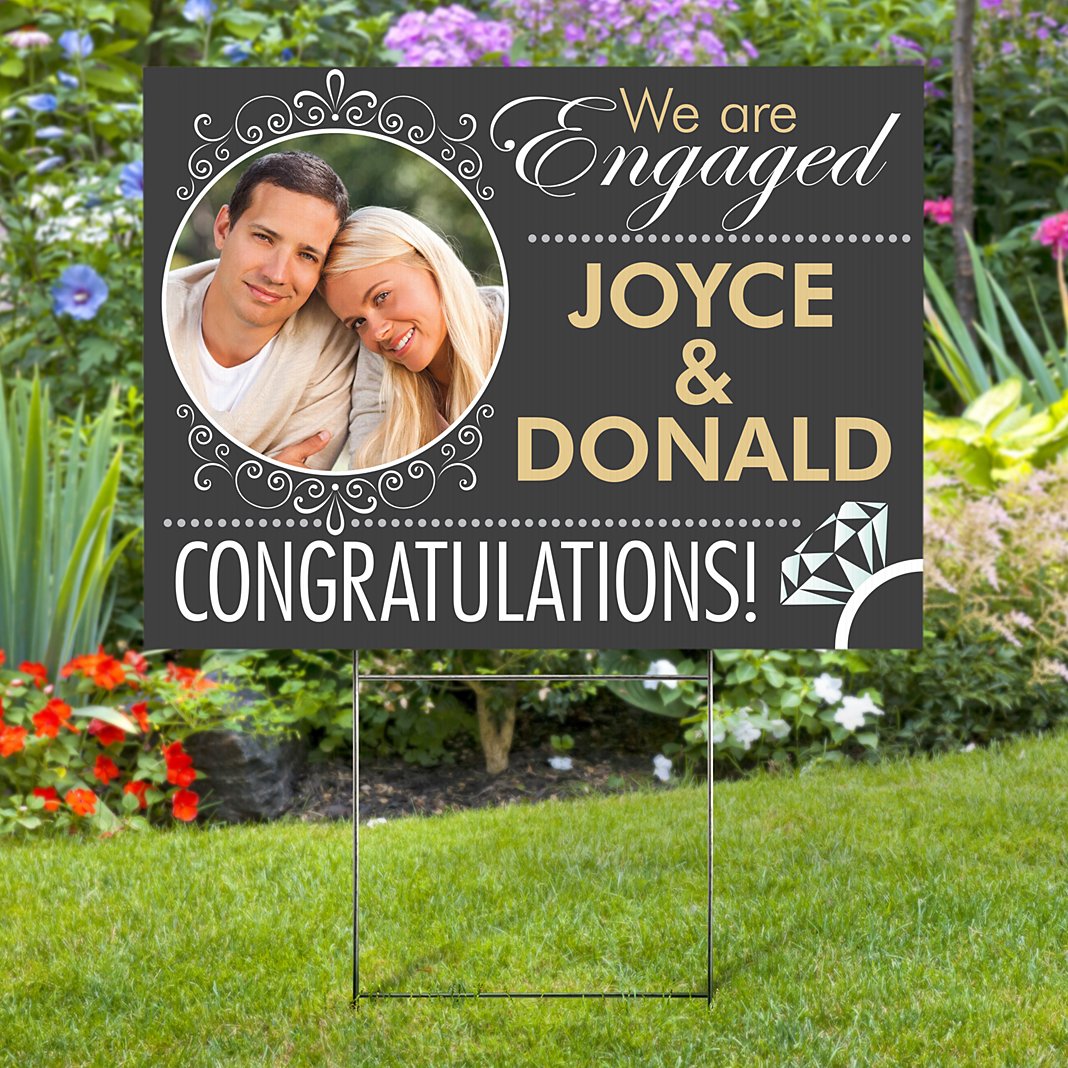 Its official! Theyre taking that big step—and you couldnt be happier. Embrace their commitment to each other with this joy-filled yard sign. Made of high-quality 4MM white corrugated plastic Includes silver “H” yard stick for display Sign measures 18"x24" Prints from edge to edge with vibrant colors Available in 1 or 2 sided print Personalize with any photo and any 3 line message up to 12 characters each and 1 line message up to 25 characters Full edge to edge printing with vibrant colors 2 sided print design reflects the same on both sides Item cannot be gift boxed