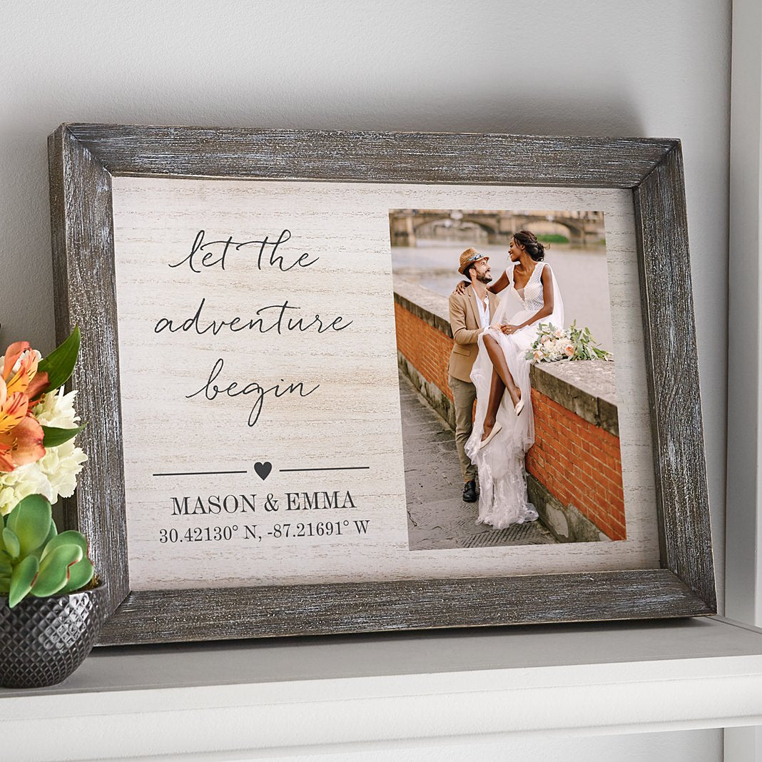 A loving look back at when—and where—it all started. Latitude and longitude mark the exact spot, a perfect photo captures the moment. All beautifully displayed on this elegantly weathered wood art. Barnwood frame with wood insertIncludes sawtooth hanger for easy hanging Measures 12"Hx16"Wx1.5"D Engrave with any photo, any 4 line message, up to 12 characters on the first 3 lines, up to 16 characters on the fourth line and any location up to 50 characters that will be converted to coordinates. You must enter your address and click the find coordinates button for coordinates to populate