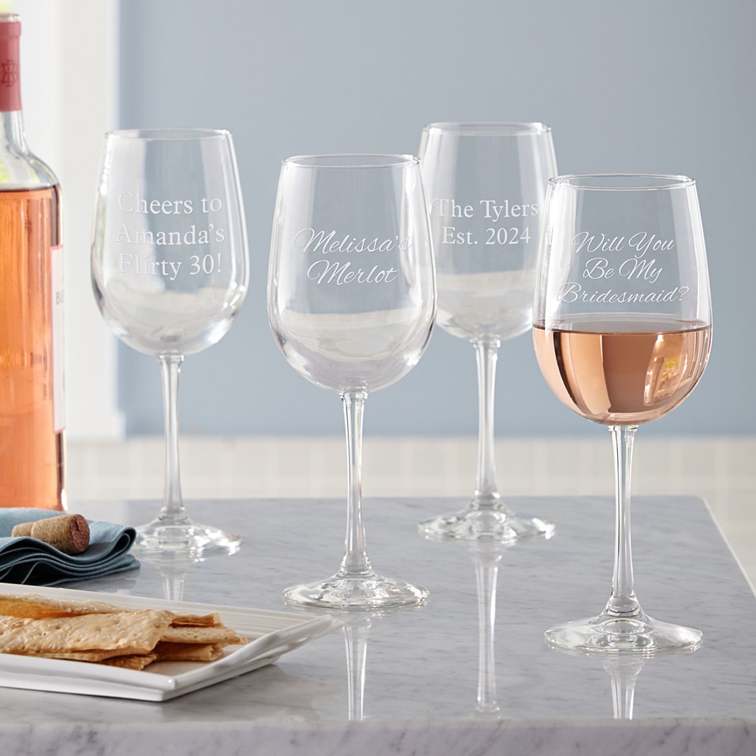 Whether the partys fancy or just the two of you, add a splash of panache—along with your unique message—to any occasion with our classic wine glass. Made in the USA Made of glass Dishwasher safe Personalize with either a set of 4 single initials in 3 fonts (Block, Swirl or Circle) or any 1 to 3 line message up to 14 characters each in Block or Script Holds 18.5 oz.; measures 9"H Sold individually or as set of 4