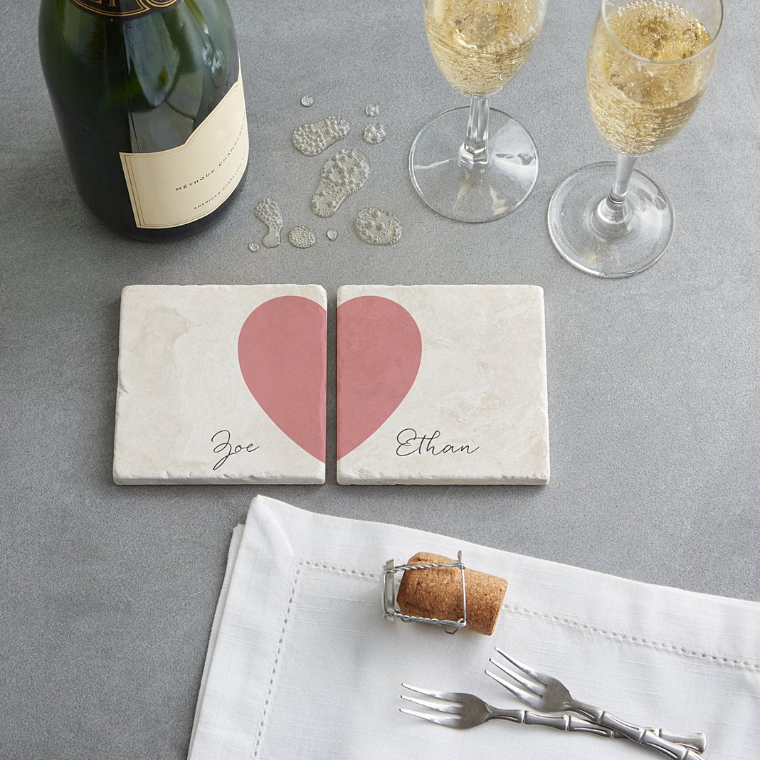 There is no “better half”, just soul mates who will always be stronger together than apart. The simple message on these contemporary coasters says it all. Exclusively from Red Envelope. Made of tumbled stone with chiseled edges Protective cork backing Set of 2, each measures 4" sq. Personalize with any 2 names up to 10 characters each