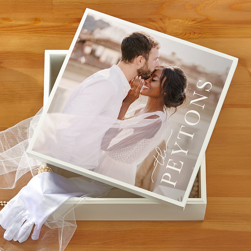Surprise your sweetie with a picture-perfect way to store mementos of your adventures. This special keepsake box doubles as a heartfelt addition to your home décor. Sweetly personalize with any photo and name up to 12 characters "The" will always appear Crafted of solid wood with white finish Measures 12"Lx12"Wx6"H Gift box not available