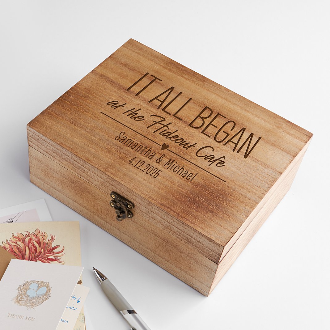 Where did their fairy tale romance take wing? Whether the locale was fancy, simple or somewhere in between, our memento box commemorates the start of something special—and provides a unique place to preserve cherished keepsakes. Exclusively from RedEnvelope. Made of wood with black felt lining Measures 7"Lx5"Wx3.5"H "It All Began" will always appear