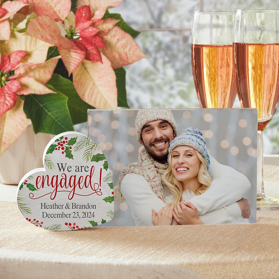 Before saying “I do!”, celebrate “I will!” with this sweet holiday-themed frame for the happy couple. Made of wood and acrylic Heart measures 3.25" sq Holds a 6"Wx4"H photo Personalizd with any 2 line message up to 20 characters each Wipe clean with damp cloth Priced as marked, not eligible for further discounts.