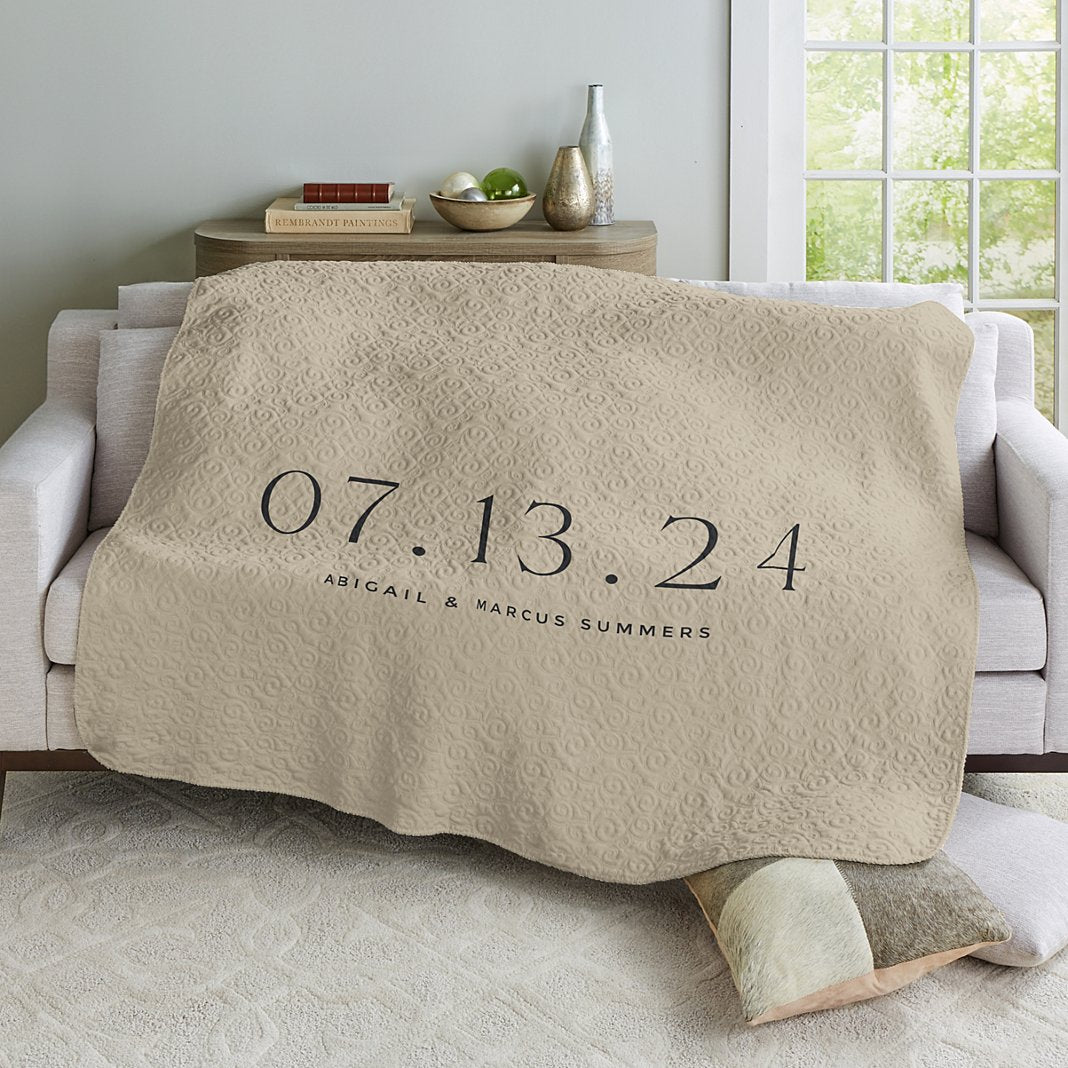 Two hearts, one love…10 warm toes! Snuggle up with your main squeeze in this ultra soft throw for movie nights or naps on the couch. Everything's better together! Personalize with any date up to 8 characters and any message up to 40 characters Choose from charcoal, tan, blue, pink, gold or aqua Made of cotton/poly blend Measures 50"x60" Machine wash separately in cold water, tumble dry low Do not bleach