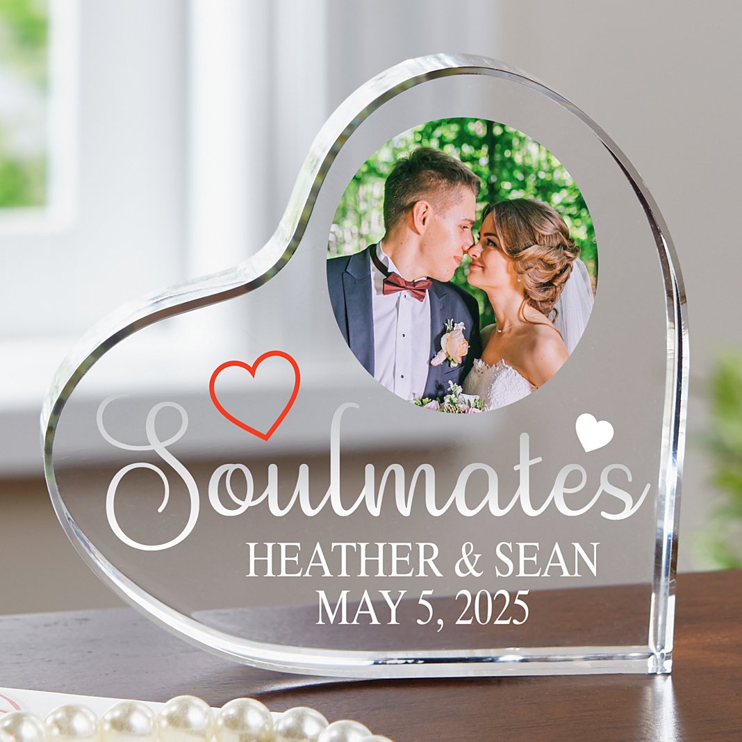 You and your beloved, forever together. This elegant heart is the perfect way to display your true and never-ending love for each other. Made of clear acrylic Measures 1"Dx4.25", photo measures 2.25" dia. Upload your photo and personalize with any 1 to 2 line message up to 18 characters each