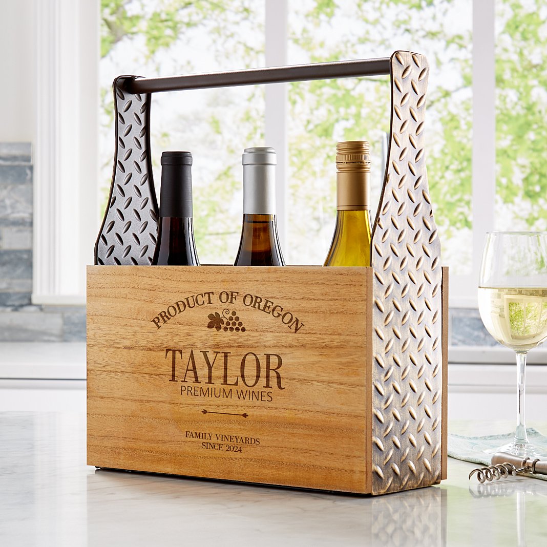 What a great way to enjoy wine on the go! This rustic wine caddy is ideal for picnics, evenings at the beach and concerts in the great outdoors. Gorgeously personalize with any top message up to 20 characters, any name up to 12 characters and any 2-line message up to 30 characters on each line Carries 3 standard wine bottles Made of wood veneer with a metal handle Measures 12.5"Wx5"Dx14.75"H
