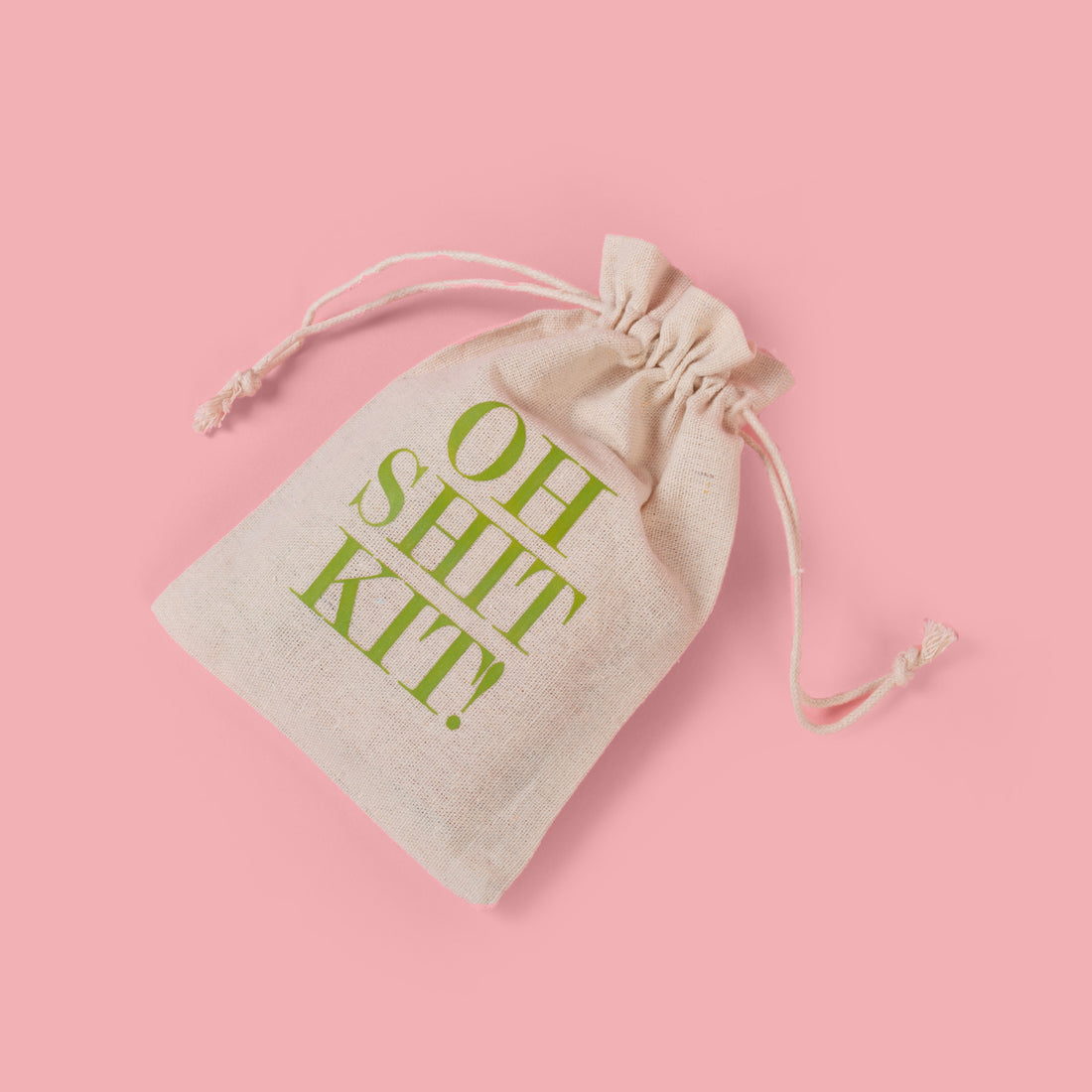 Shit happens! Be prepared with our Oh Shit Kit bag - the perfect cotton draw-string bag you can fill with all of the necessities you need for a refreshing morning! Each bag has bright green text and is approximately 7x5 inches in size. This listing is for empty bags. Assembled bags are also available through our store.
