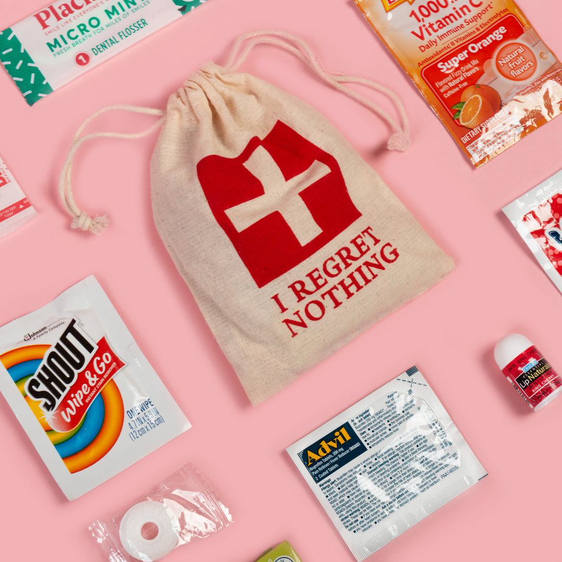 Completely assembled in an adorable first aid cotton bag branded with "I Regret Nothing", these hangover kits come in a variety of sizes and are perfect for any event! Bag is approximately 5.5 x 4 inches.