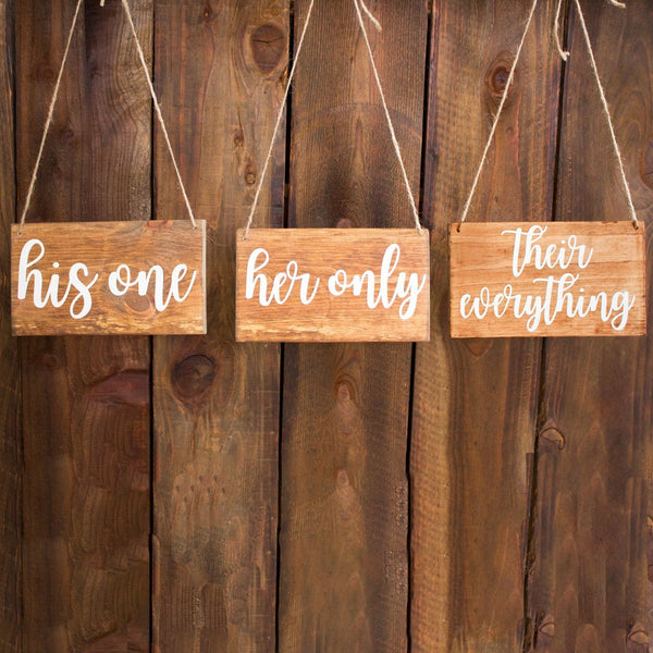 "His One" & "Her Only" & "Their Everything" Hanging Chair Signs. Made from stained wood and hand painted. Comes with ribbon or jute twine for hanging. Also perfect for engagement photos! Product Information Sold as a set. Satin ribbon, jute twine or no hanging options. Dimensions: 10"� L x 5.5"� H each Digitally printed with weather-resistant, UV cured ink Natural variations in lumber color shades, knots, and wood grain will occur. Not free-standing Colors shown in the photo: Ebony Stain White Lettering Ships in 3-5 business days.