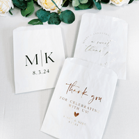 Our Custom Foil Wedding Treat Bags add a touch of elegance and sophistication to your special day. These exquisite bags are crafted with high-quality foil material, featuring a lustrous sheen that beautifully complements the glamour of weddings. These treat bags are available with a variety of foil colors and designs to suit any wedding theme. Perfect for presenting wedding favors or treats to your guests on your wedding day! SIZE - These paper treat bags are lined with wax paper, food-safe and can be filled with items like candies, cookies, trail mix, etc. - Bag size: 5 3/4" x 8" READY TO ORDER? Once the item is added to your cart, please leave the following in thePERSONALIZATION section: - Foil Color - Design -Personalization Information - Any other information we need to know PROOFS We send proofs for all personalized items within 72 business hours. This digital proof is sent to you via the email address on your order. One complimentary proof will be sent to ensure you are fully in love with the design. Additional proofs will cost $5. Your order is held until we hear back from you with approval that all spelling and punctuation is correct. Please note that are orders are immediately placed into production once we receive your approval, and changes cannot be made. A delay in approving your proof WILL delay the production time stated below. PRODUCTION TIME Please review our FAQ section for the most up to date production timeframes. Please note production does not begin under your proof has been approved. Shipping takes up to 5 days in US. Please contact us for a shipping quote if you are an international customer. We use UPS and FedEx for delivery and therefore are unable to ship to PO Boxes. EXTRA THINGS TO KNOW - One Imprint Color Only - Made & Printed in the USA - Minimum Order - 10 Treat Bags COLOR INFORMATION Keep in mind colors may vary slightly from your proof to your delivered product due to browser and monitor settings.