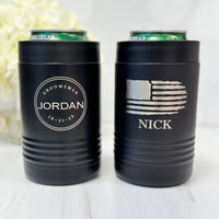 These laser engraved can coolers are engraved in our Reading, Pennsylvania studio. Perfect for a groomsmen gift for your wedding, a special gift for dad, or a just because gift for the favorite guy in your life. They are heat and cold resistant and hold cans and bottles. Simply screw off the rubber top and place the beverage inside. COLOR Black SIZE 3 1/8"(L) x 5 1/4"(H) ITEM: 1 CAN COOLER CLEANING INSTRUCTIONS Not recommended for dishwashers, hand wash only.
