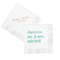Celebrate the new mr and mrs and add a fun personalized element to your wedding. Perfect for cocktail hour, appetizers, cake, or just add to each place setting for a unique table decoration. Choose from multiple napkin and imprint colors to make these napkins truly unique! SIZES - Cocktail Napkins are approximately 4.75" x 4.75" and 5" x 5" (sizes vary by color) - Luncheon Napkins are approximately 6.25" x 6.25" - Guest Towels are approximately 4.25" x 8.5" ADDITIONAL DETAILS - These napkins are a soft 3 ply - One Imprint Color Only - Recyclable - Made & Printed in the USA - Minimum Order - 25 Napkins