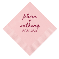 Celebrate the new mr and mrs and add a fun personalized element to your wedding. Perfect for cocktail hour, appetizers, cake, or just add to each place setting for a unique table decoration. Choose from multiple napkin colors and imprint colors to make these napkins truly unique! SIZES - Cocktail Napkins are approximately 4.75" x 4.75" and 5" x 5" (sizes vary by color) - Luncheon Napkins are approximately 6.25" x 6.25" - Guest Towels are approximately 4.25" x 8.5" ADDITIONAL DETAILS - These napkins are a soft 3 ply - One Imprint Color Only - Recyclable - Made & Printed in the USA - Minimum Order - 25 Napkins