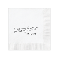 Add a truly personal element to your next event. Turn your handwritten note into a beautiful cocktail napkin! These napkins are a perfect addition to your wedding decor. Choose from multiple napkin and imprint colors to make these napkins truly unique! SIZES - Cocktail Napkins are approximately 4.75" x 4.75" and 5" x 5" (sizes vary by color) - Luncheon Napkins are approximately 6.25" x 6.25" - Guest Towels are approximately 4.25" x 8.5" ADDITIONAL DETAILS - These napkins are a soft 3 ply - One Imprint Color Only - Recyclable - Made & Printed in the USA - Minimum Order - 25 Napkins ϣ NOTE REQUIREMENTS - If uploading/sending a photo of the writing, it must be on a solid white background and be of high quality. - If uploading/sending a vector file, it must outlined and in a single color.