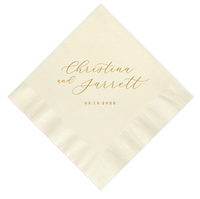 Celebrate your big day with our Personalized First Name Wedding Cocktail Napkins! These elegant napkins are the perfect addition to your wedding reception, adding a touch of personalization and sophistication to your cocktail hour. Also perfect for appetizers, cake, or just add to each place setting for a unique table decoration. Choose from multiple napkin and imprint colors to make these napkins truly unique! SIZES - Cocktail Napkins are approximately 4.75" x 4.75" and 5" x 5" (sizes vary by color) - Luncheon Napkins are approximately 6.25" x 6.25" - Guest Towels are approximately 4.25" x 8.5" ADDITIONAL DETAILS - These napkins are a soft 3 ply - One Imprint Color Only - Recyclable - Made & Printed in the USA - Minimum Order - 25 Napkins