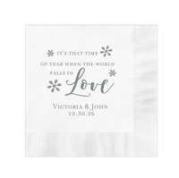 Celebrate your winter wedding in style with our Personalized Winter Wedding Napkins! These beautifully designed napkins add a touch of elegance and charm to your special day, featuring personalized details that make them uniquely yours. Whether for the cocktail hour, reception, or as a keepsake for your guests, these napkins bring warmth and a personal touch to your celebration. Make your winter wedding even more memorable with these stunning personalized napkins that guests will cherish! SIZES - Cocktail Napkins are approximately 4.75" x 4.75" and 5" x 5" (sizes vary by color) - Luncheon Napkins are approximately 6.25" x 6.25" - Guest Towels are approximately 4.25" x 8.5" ADDITIONAL DETAILS - These napkins are a soft 3 ply - One Imprint Color Only - Recyclable - Made & Printed in the USA - Minimum Order - 25 Napkins