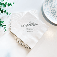 Add timeless detail to your pre-wedding celebration with our Elegant Night Before napkins. Featuring classic calligraphy and personalized with names and a date, these soft, food-safe napkins elevate cocktail hour, dinner service, or dessert bars at rehearsal dinners and welcome events. A beautiful finishing touch to your sophisticated wedding weekend. SIZES - Cocktail Napkins are approximately 4.75" x 4.75" and 5" x 5" (sizes vary by color) - Luncheon Napkins are approximately 6.25" x 6.25" - Guest Towels are approximately 4.25" x 8.5" ADDITIONAL DETAILS - These napkins are a soft 3 ply - One Imprint Color Only - Recyclable - Made & Printed in the USA - Minimum Order - 25 Napkins