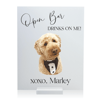 This is a perfect signature drink sign for a wedding or party. Add a special touch and include a likeness of your favorite four legged friend to your wedding reception bar. Material Options Acrylic (Clear, Frosted, Glossy White, Glossy Black) Card Stock Print Canvas Digital JPEG How to Display Acrylic 8"x10" & 11"x14": No frame needed - Ready to display 16"x20" & 18"x24": No stands included - Recommended to be displayed on an easel Canvas - No frame needed, displays well on an easel. Not recommended for outdoor use Card Stock - Just frame & display Hardware for hanging not included. Made and printed in the USA Custom Pet Photos When choosing a photo for your artwork, please keep in mind that the artwork will resemble the photograph sent. The better the photo, the better the rendering! A few tips for selecting the best photo: - Photo is well-lit and image is crisp - Background contrasts well with your pet - Pet is forward facing - Pet should be posed in the manner you would like on the product - Pet should be only be wearing items you would like to see in the design, as we are unable to move items such as collars and leashes - Be sure entire pet is shown in photo and not cropped (i.e. for full body artwork, photo must show pet's entire body) If you decide another photograph is needed once we send your proof from the original photo we've been given, you will need to repay the redraw art fee. However, we do allow 2 revisions for changes of the original proofthat do not require a new photo.