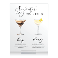 Add a touch of sophistication and style to your wedding with our beautifully designed Signature Cocktails Sign. This customizable sign showcases your curated drink selection, guiding your guests with ease as they make their beverage choices. Whether it's a selection of signature cocktails, wine, or a classic bar menu, this sign seamlessly complements your wedding décor. Perfect for reception tables, bars, or cocktail areas, this sign adds a chic and functional element to your celebration! Material Options Acrylic (Clear, Frosted, Glossy White, Glossy Black) Card Stock Print Canvas Digital JPEG How to Display Acrylic 8"x10" & 11"x14": No frame needed - Ready to display 16"x20" & 18"x24": No stands included - Recommended to be displayed on an easel Canvas - No frame needed, displays well on an easel. Not recommended for outdoor use Card Stock - Just frame & display Hardware for hanging not included. Made and printed in the USA
