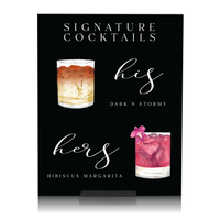 Add a touch of sophistication and style to your wedding with our beautifully designed Signature Cocktails Sign. This customizable sign showcases your curated drink selection, guiding your guests with ease as they make their beverage choices. Whether it's a selection of signature cocktails, wine, or a classic bar menu, this sign seamlessly complements your wedding décor. Perfect for reception tables, bars, or cocktail areas, this sign adds a chic and functional element to your celebration! Material Options Acrylic (Clear, Frosted, Glossy White, Glossy Black) Card Stock Print Canvas Digital JPEG How to Display Acrylic 8"x10" & 11"x14": No frame needed - Ready to display 16"x20" & 18"x24": No stands included - Recommended to be displayed on an easel Canvas - No frame needed, displays well on an easel. Not recommended for outdoor use Card Stock - Just frame & display Hardware for hanging not included. Made and printed in the USA