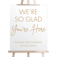 Express your gratitude with the We're So Glad You're Here Wedding Ceremony Sign, a heartfelt way to show appreciation to your loved ones for sharing in your special day. This elegant sign features a simple, yet meaningful message that sets the tone for your ceremony or reception, welcoming guests and making them feel appreciated from the moment they arrive. Material Options Acrylic (Clear, Frosted, Glossy White, Glossy Black) - 1/8" thick Card Stock Print Canvas Digital JPEG How to Display Acrylic 8"x10" & 11"x14" - No frame needed, ready to display 16"x20" & 18"x24" - No stands included, recommended to be displayed on an easel Canvas - No frame needed, displays well on an easel. Not recommended for outdoor use Card Stock - Just frame & display Hardware for hanging not included. Made and printed in the USA