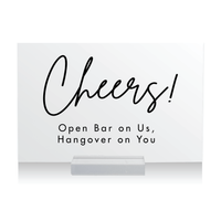 Add a special touch to your wedding bar with this Open Bar acrylic sign reminding your guests that any hangover from the night is on them. Our premium acrylic signs, with numerous customization options available, you can create a beautiful sign that perfectly matches your wedding theme and colors. Make your wedding day even more memorable with one of our unique wedding signs! Details: Material: 1/8" thick Acrylic Hardware for hanging not included. Made and Printed in USA Easel and accessories NOT included Care Instructions:Clean with soft cloth and ammonia free cleaner Print Method:UV Print (No vinyl)