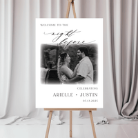 Set the perfect tone for your rehearsal dinner with theThe Night Before Photo Welcome Sign! This charming, custom sign is a fun and meaningful way to kick off your wedding festivities. Featuring a personalized design, this sign celebrates the night before your big day with a touch of elegance and warmth. Material Options Acrylic (Clear, Frosted, Glossy White, Glossy Black) - 1/8" thick Card Stock Print Canvas Digital JPEG How to Display Acrylic 8"x10" & 11"x14" - No frame needed, ready to display 16"x20" & 18"x24" - No stands included, recommended to be displayed on an easel Canvas - No frame needed, displays well on an easel. Not recommended for outdoor use Card Stock - Just frame & display Hardware for hanging not included. Made and printed in the USA