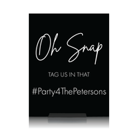 Add a special touch to your wedding day with a custom Oh Snap hashtag acyclic sign from Rubi and Lib Design Studio. Ask guests to add your custom hashtag to any photos they post on social media so you have a fun way to see photos your photographer may not capture! Our premium acrylic signs, with numerous customization options available, you can create a beautiful sign that perfectly matches your wedding theme and colors. Make your wedding day even more memorable with one of our unique wedding signs! Details: Material: 1/8" thick Acrylic Hardware for hanging not included. Made and Printed in USA Easel and accessories NOT included Care Instructions:Clean with soft cloth and ammonia free cleaner Print Method:UV Print (No vinyl)