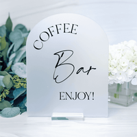 Brew up something special with this "Coffee Bar €“ Enjoy!" acrylic sign€”an ideal finishing touch for your self-serve coffee station at weddings, showers, or corporate events. Whether you're offering fresh brews, a full espresso bar, or cozy seasonal drinks, this sign invites guests to sip and enjoy in style. Featuring a modern mix of curved serif and flowing script fonts, this freestanding sign blends effortlessly with any décor€”from minimalist to rustic or romantic. Details: Material: 1/8" thick Acrylic Hardware for hanging not included. Made and Printed in USA Easel and accessories NOT included Care Instructions:Clean with soft cloth and ammonia free cleaner Print Method:UV Print (No vinyl)