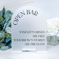 Add a playful twist to your wedding or party bar with this cheeky "Open Bar" acrylic sign. Featuring the phrase "Tonight's Drinks Are Free, Tomorrow's Stories Are Priceless", it's the perfect way to welcome guests to your drink station and set a fun, lighthearted tone for the evening. Printed on premium acrylic with bold, clean fonts and a curved layout, this freestanding sign looks great with any bar décor€”from classy and modern to rustic or whimsical. Details: Material: 1/8" thick Acrylic Hardware for hanging not included. Made and Printed in USA Easel and accessories NOT included Care Instructions:Clean with soft cloth and ammonia free cleaner Print Method:UV Print (No vinyl)