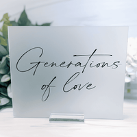 Celebrate family legacy and the love that spans generations with this beautifully designed "Generations of Love" acrylic sign. Perfect for displaying at weddings, anniversary parties, or family gatherings, this sign adds a meaningful touch to a table filled with heirloom photos, family trees, or cherished keepsakes. Its timeless script and clean design complement any event theme€”from rustic to modern€”and help you honor the past while celebrating the present. Details: Material: 1/8" thick Acrylic Hardware for hanging not included. Made and Printed in USA Easel and accessories NOT included Care Instructions:Clean with soft cloth and ammonia free cleaner Print Method:UV Print (No vinyl)
