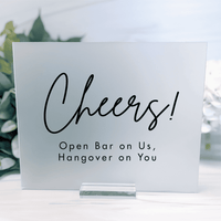 Add a playful touch to your drink station with this "Cheers! Open Bar on Us, Hangover on You" acrylic sign. Perfect for weddings, parties, or any celebration with an open bar, this witty sign sets the mood while letting guests know to sip (or celebrate) responsibly. The sleek and modern design features a bold mix of script and serif fonts, making it both eye-catching and stylish. Freestanding and easy to display, it's a must-have for your cocktail hour or reception bar setup. Details: Material: 1/8" thick Acrylic Hardware for hanging not included. Made and Printed in USA Easel and accessories NOT included Care Instructions:Clean with soft cloth and ammonia free cleaner Print Method:UV Print (No vinyl)