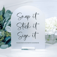 Guide your guests through the photo guestbook experience with this stylish "Snap it, Stick it, Sign it" acrylic sign. Perfect for weddings, bridal showers, birthdays, or graduation parties, this sign invites guests to capture a memory, add it to your guestbook, and leave a message. Featuring a fun and modern design in a vertical layout, this freestanding sign adds personality to your welcome or guestbook table€”while making instructions clear and charming. Details: Material: 1/8" thick Acrylic Hardware for hanging not included. Made and Printed in USA Easel and accessories NOT included Care Instructions:Clean with soft cloth and ammonia free cleaner Print Method:UV Print (No vinyl)