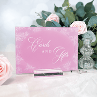 Help guests find your gift table with this elegant acrylic Cards and Gifts sign. Featuring refined script and floral detailing, this sign adds a polished finishing touch to your wedding or event setup. Crafted from durable acrylic and printed directly on the surface for a sleek finish, it's available in multiple sizes to suit your table layout. Whether displayed at a wedding, shower, or party, it brings clarity and style to your celebration. Details: Material: 1/8" thick Acrylic Hardware for hanging not included. Made and Printed in USA Easel and accessories NOT included Care Instructions:Clean with soft cloth and ammonia free cleaner Print Method:UV Print (No vinyl)