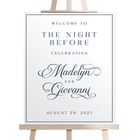 Set the tone for a sophisticated celebration with our Elegant Night Before welcome sign. Personalized with the couple's names and wedding date, this beautifully designed sign is perfect for greeting guests at your rehearsal dinner or welcome party. Featuring timeless typography and delicate detailing, it adds a polished touch to your pre-wedding décor. Display at your entrance, gift table, or drink station to create a memorable first impression. Material Options Acrylic (Clear, Frosted, Glossy White, Glossy Black) - 1/8" thick Card Stock Print Canvas Digital JPEG How to Display Acrylic 8"x10" & 11"x14" - No frame needed, ready to display 16"x20" & 18"x24" - No stands included, recommended to be displayed on an easel Canvas - No frame needed, displays well on an easel. Not recommended for outdoor use Card Stock - Just frame & display Hardware for hanging not included. Made and printed in the USA