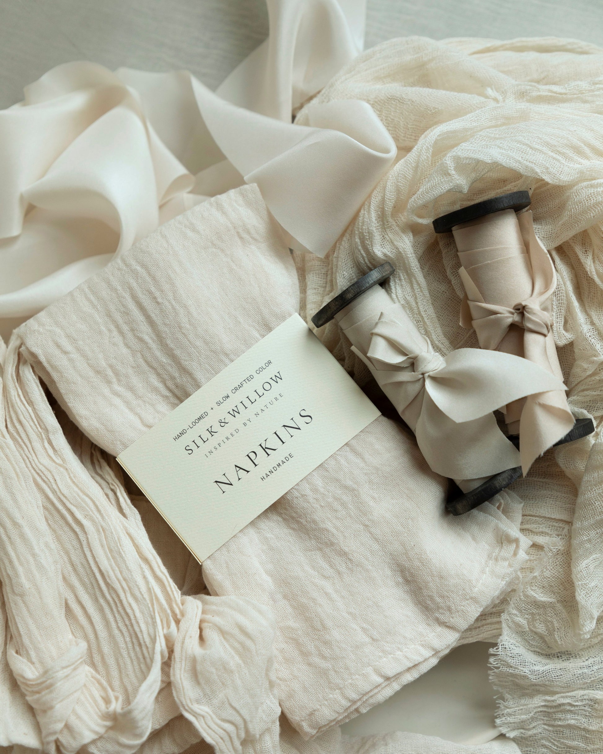 Elevate your table settings with our Antique White Napkins. Their timeless, soft white hue brings a touch of organic sophistication to any wedding or event, effortlessly complementing any color palette. Naturally dyed to achieve a soft white shade, these napkins reflect our dedication to sustainable practices and craftsmanship. Each piece is hand-loomed and sewn by skilled artisan weavers, ensuring quality and authenticity in every detail. Designed for bespoke events, these handmade napkins combine refined charm with earthy simplicity, creating a truly memorable table setting. Treat your guests to the artistry of sustainable beauty and curate a table that tells a story of care, craftsmanship, and refinement. These napkins have a hand-sewn hem and are made from hand-spun cotton which gets softer with each washing. Hand-loomed tight-weave cotton | Slow-crafted color. Approx. size: 18 x 26 inches For 100+ Napkins, contact us for a custom order at: orders@silkandwillow.com