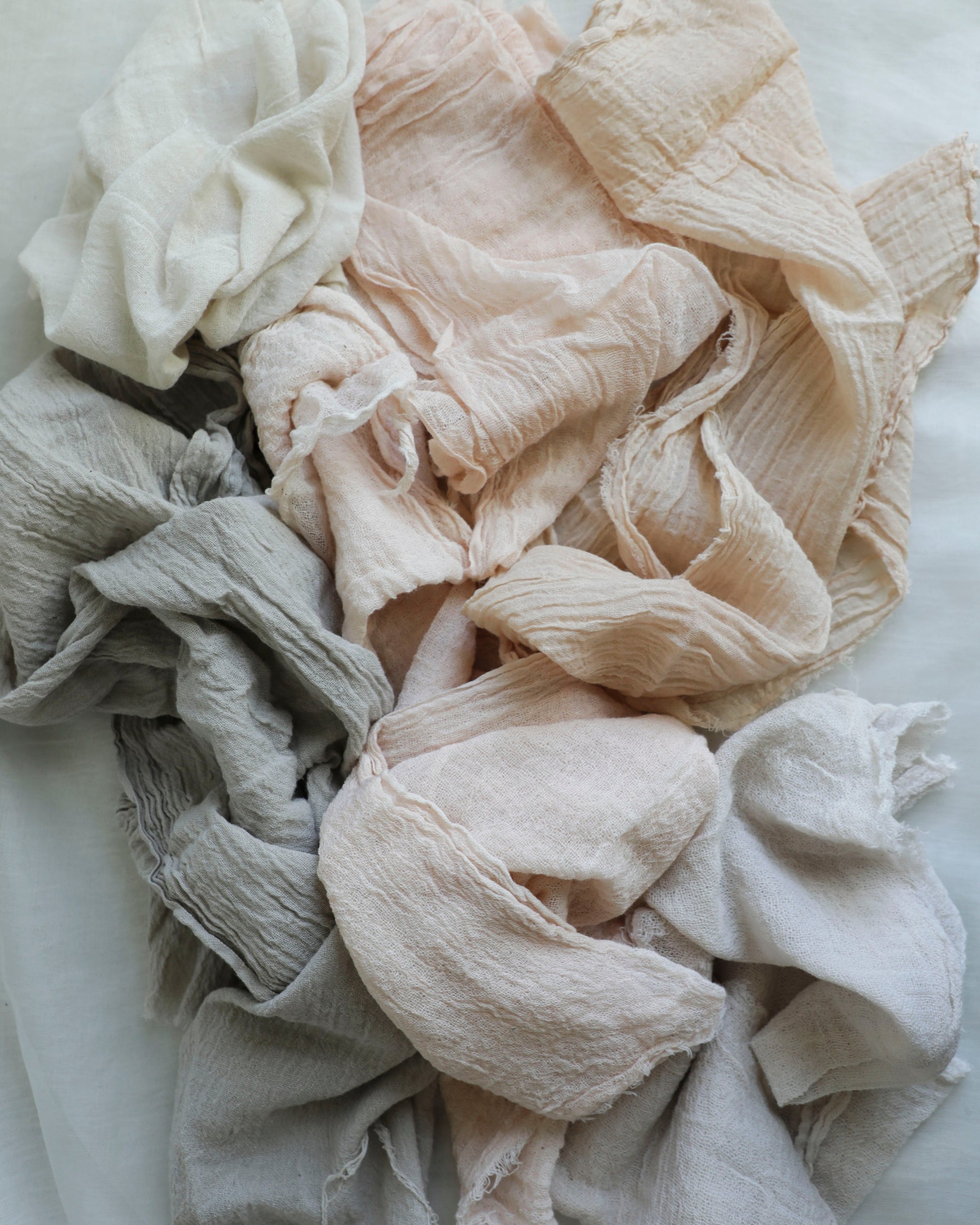 A bundle of natural cotton textiles, in a range of soft romantic hues, designed to inspire your creativity. This collection of cotton fabric remnants, curated from our personal styling collection, is perfect for your flatlay styling, product styling, or food styling. These are previously loved textiles that come from our styling shelves. We have not measured or inspected each one, we just gathered them together to offer you the best deal on a collection of goodies. These are smaller pieces that can be used in prop styling or crafting projects. Review photos to see what is included. This bundle includes a range of blush, gray, and cream hues. With varied textures and sizes, this bundle offers endless possibilities. Whether you€™re crafting a refined flatlay, adding warmth to product styling, or elevating a food styling project, these naturally dyed fabrics bring depth and dimension to your work. This bundle as unique as the stories you wish to tell.