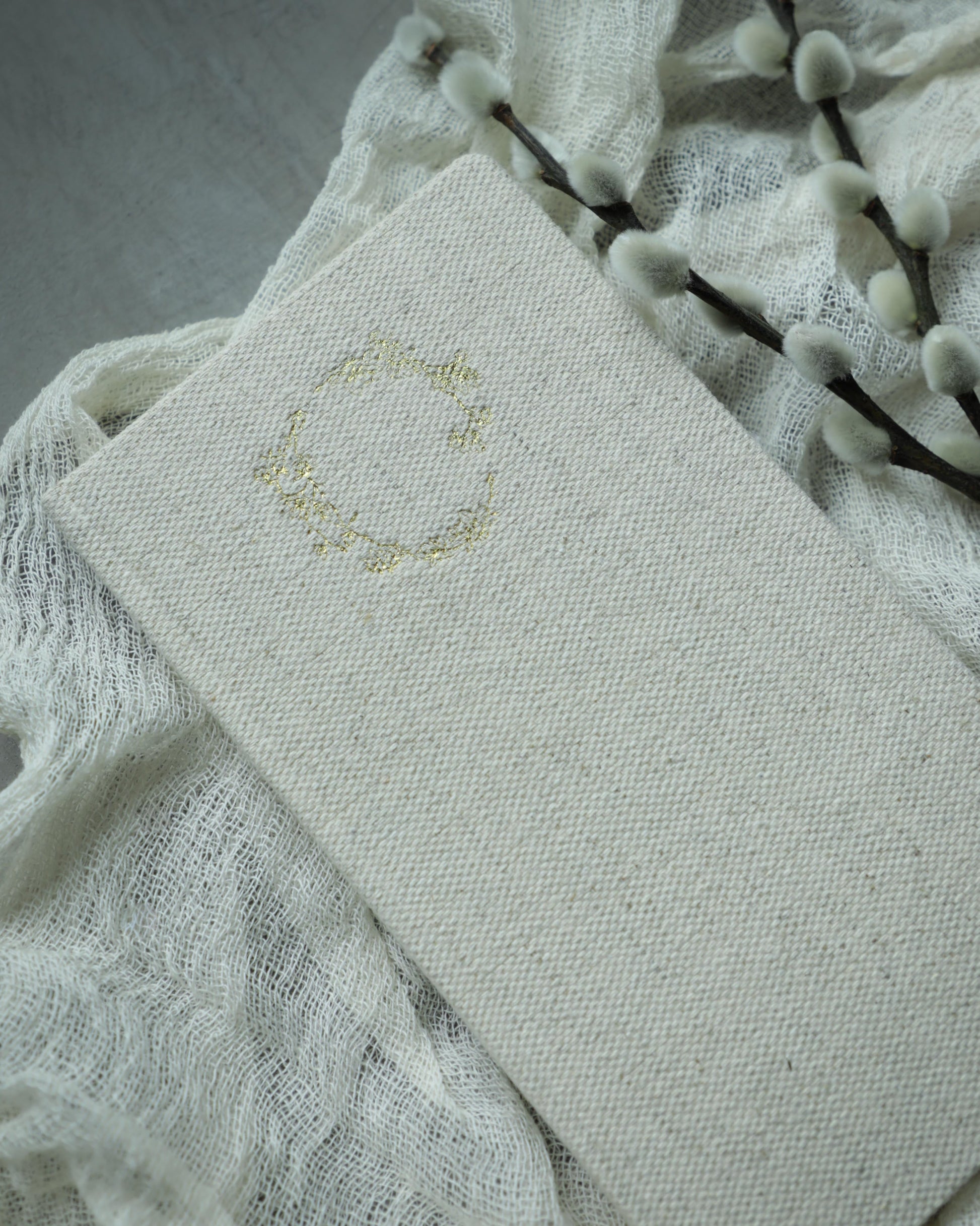 This petite linen hardcover notebook was designed and created by Seniman Calligraphy. Each book features a gold foil Magnolia Wreath on the cover and includes 80 lined pages of acid-free paper with awhite ribbon to help keep your place. Dimensions / 6.75 x 3.75 x 0.75€� Color /Taupe Linen