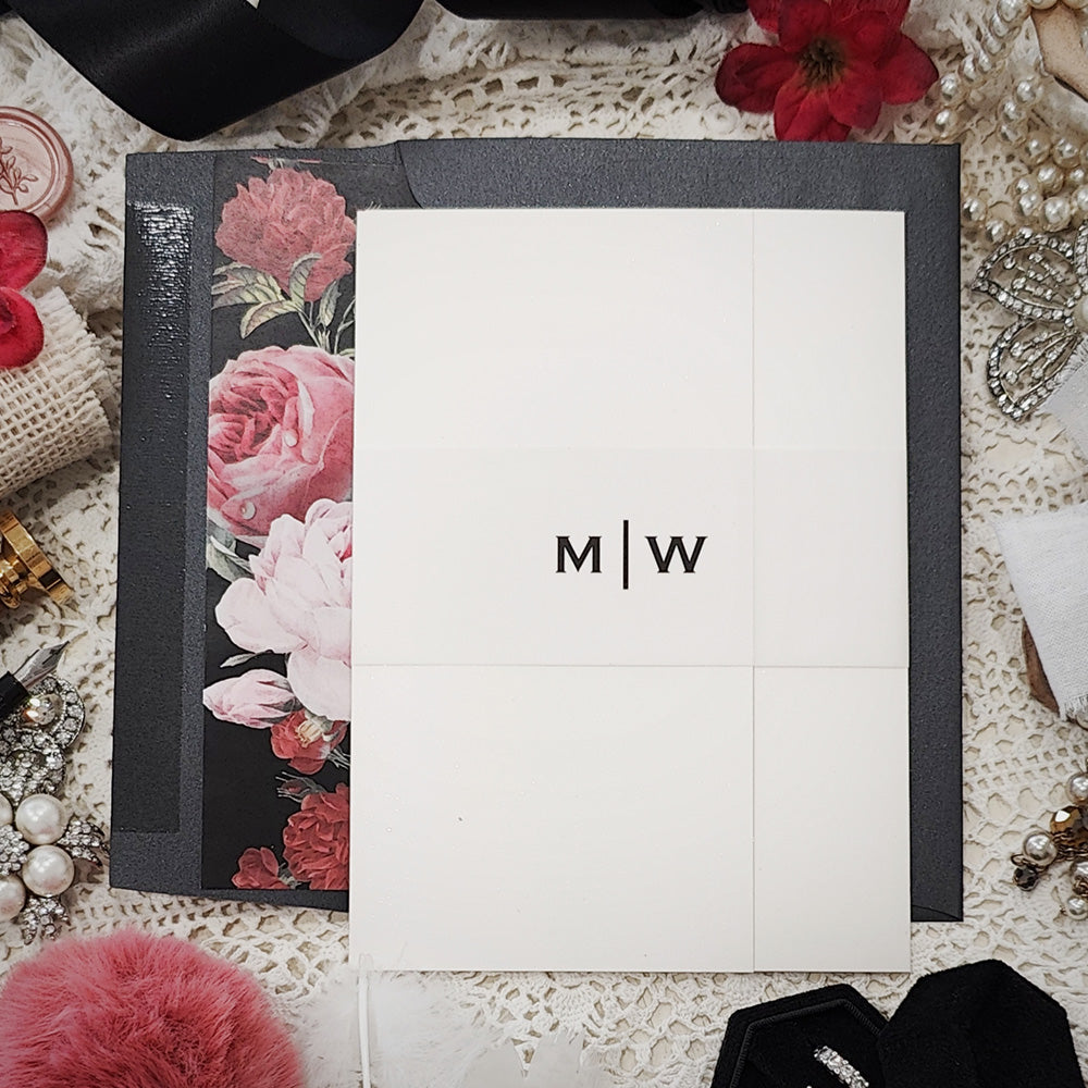 This is a minimal yet polished pocketfold invitation done in our antique pearl paper. It is wrapped in a translucent vellum band printed with a custom monogram. Simple yet bold. When you open the invitation it presents the wedding details in a modern layout with a pocket on the side for additional cards.