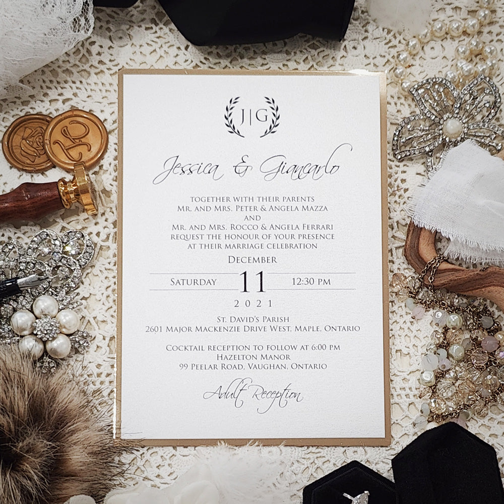 A polished yet minimal layered single panel invitation with a formal wreath monogram at top and added layer creating a gold mirror border.