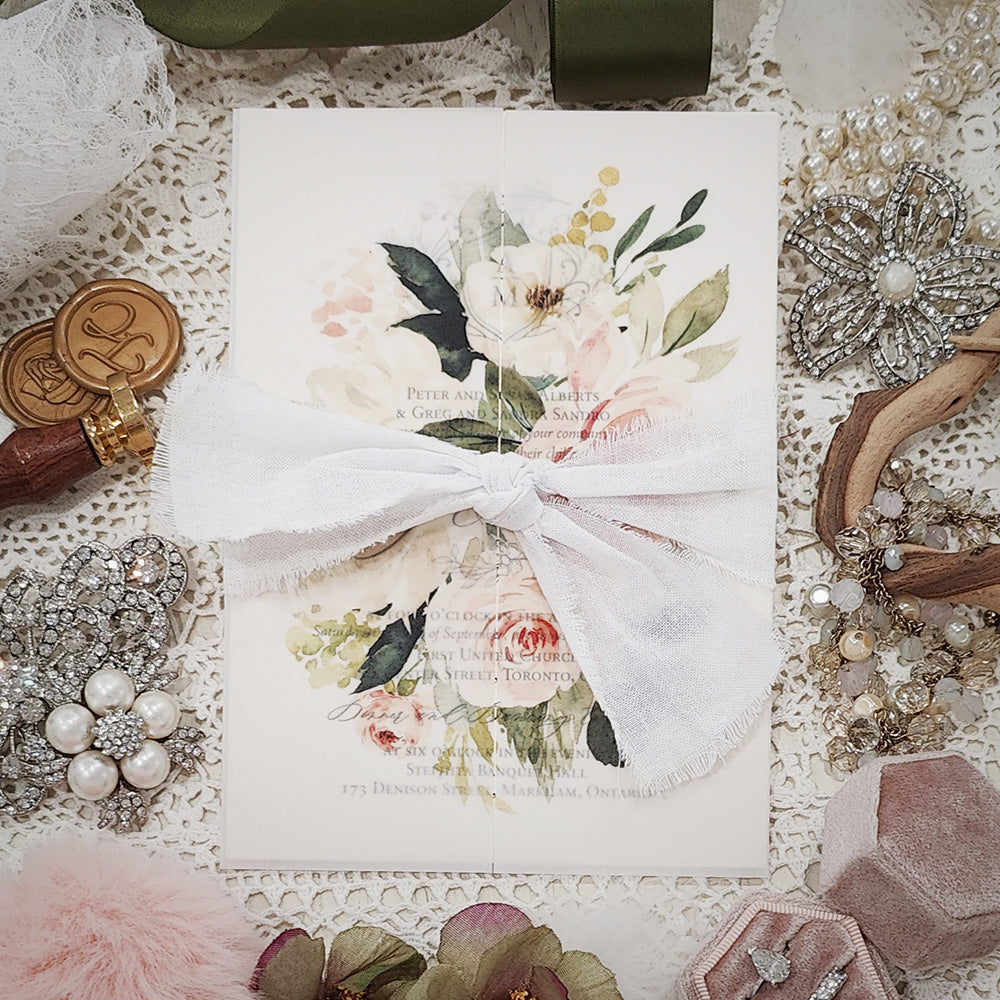 This exquisite wedding invitation printed on our anqitue pearl paper has a printed monogram crest at the top and floral vellum wrap. Tied around the middle of the invitation is a torn cotton ribbon in white.