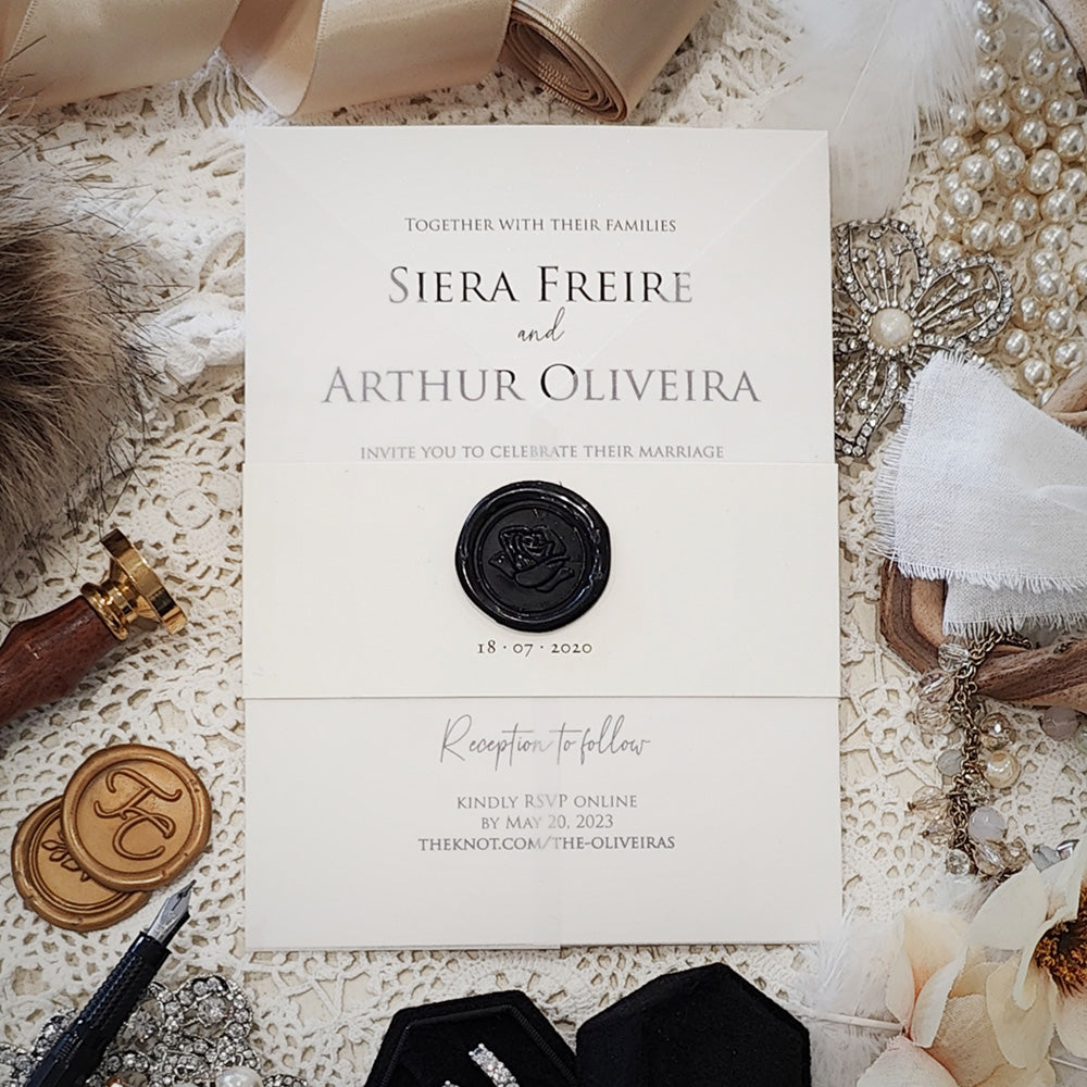 This beautiful formal single panel invitation features a classic layout with a beautiful translucent vellum wrap with angled cuts and a cardstock band around the middle. The band is printed with the event date and has a striking black wax seal in the center.
