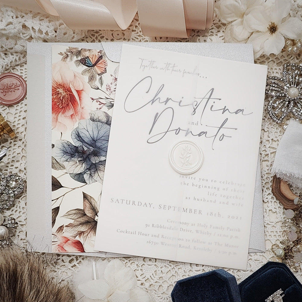 This unique and eye catching invitation is printed using a beautiful artistic font to showcase the bride and grooms name. Keeping the style minimal the invitation is wrapped with a pretty translucent vellum wrap and finished off with charming ivory wax seal.