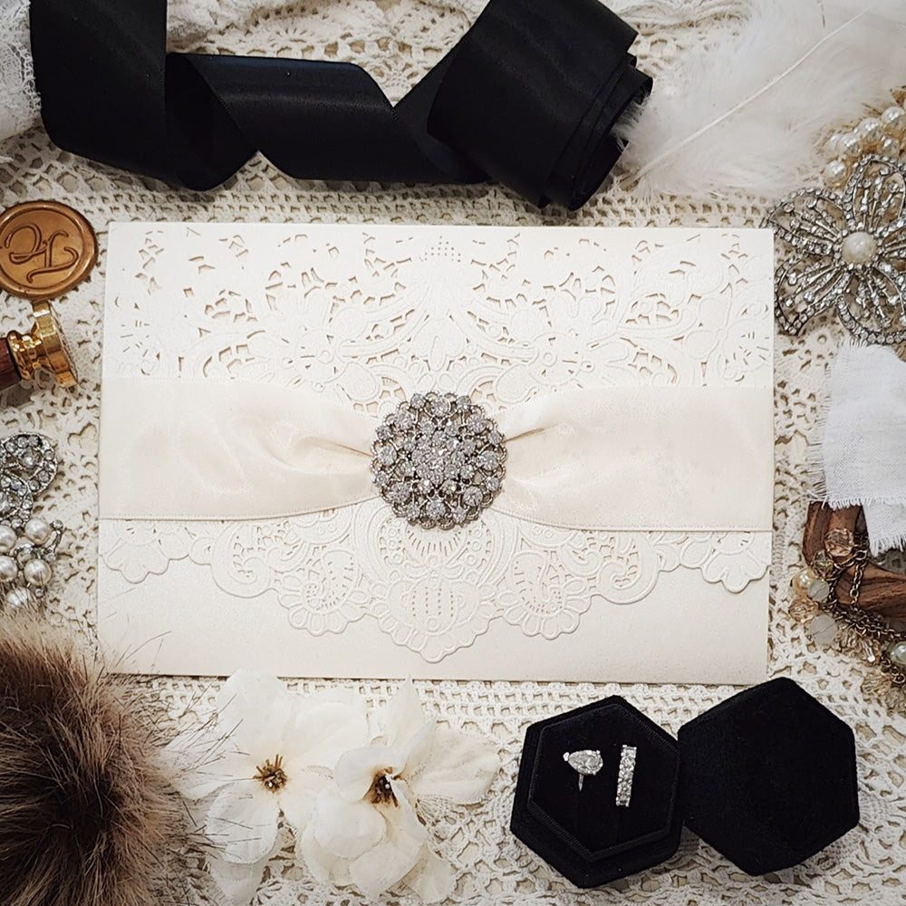 Combining two of our most popular elements this elegant ivory lasercut pocketfold invitation is classic and beautiful. The lasercut has an embossed raised feel and is embellished with a gorgeous antique satin ribbon and a luxurious rhinestone brooch. When the invitation is open it shows the event details in the middle and a pocket at the bottom for extra inserts.