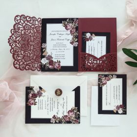 Blooms Around Every Turn-Burgundy Laser Cut Pocket Fold Invitation With Victorian Inspired Floral Swws180