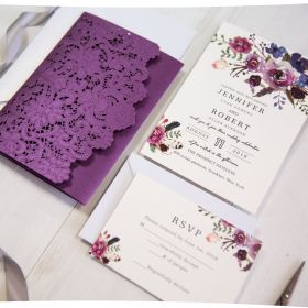 Vivid Shades Of Purple Watercolor Floral Laser Cut Pocket Wedding Invitations Swws195